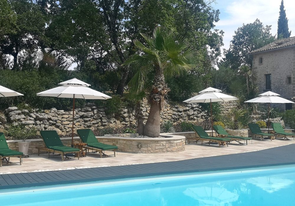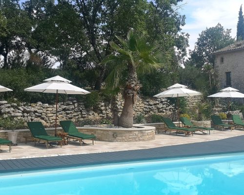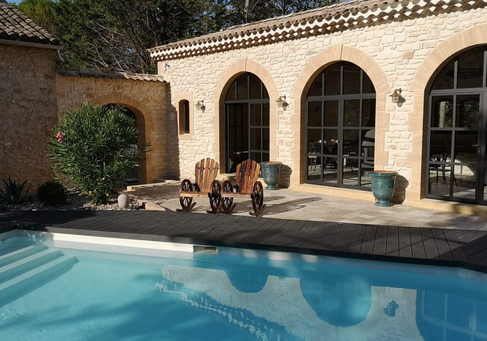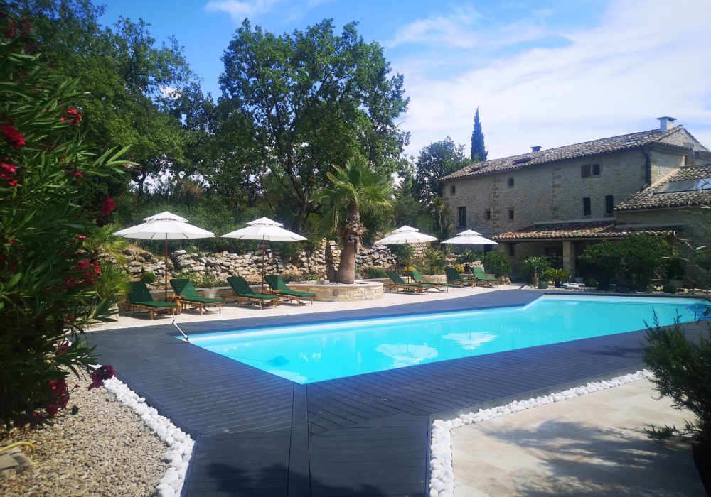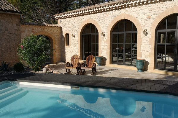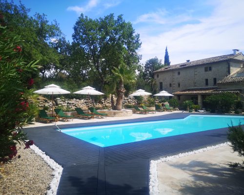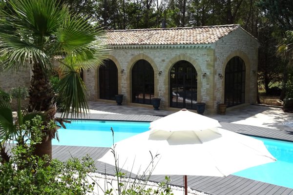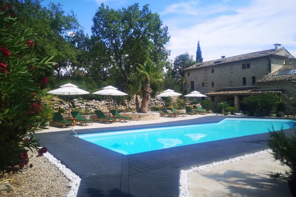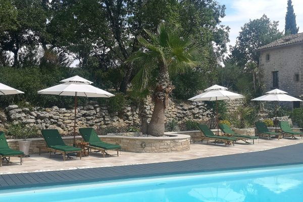 Des grands espaces, des murs en pierre de 50 cm d’épaisseur, des vieilles poutres, des vieux carreaux en terre cuite, des portes fenêtres et fenêtres en fer forgé, du travertin, une fontaine en pierre vers du pont du gard, des vielles tuiles … Si vous aimez l’histoire et les vieilles pierres vous serez très certainement aux anges.