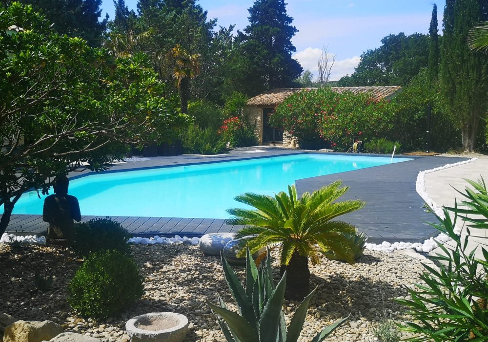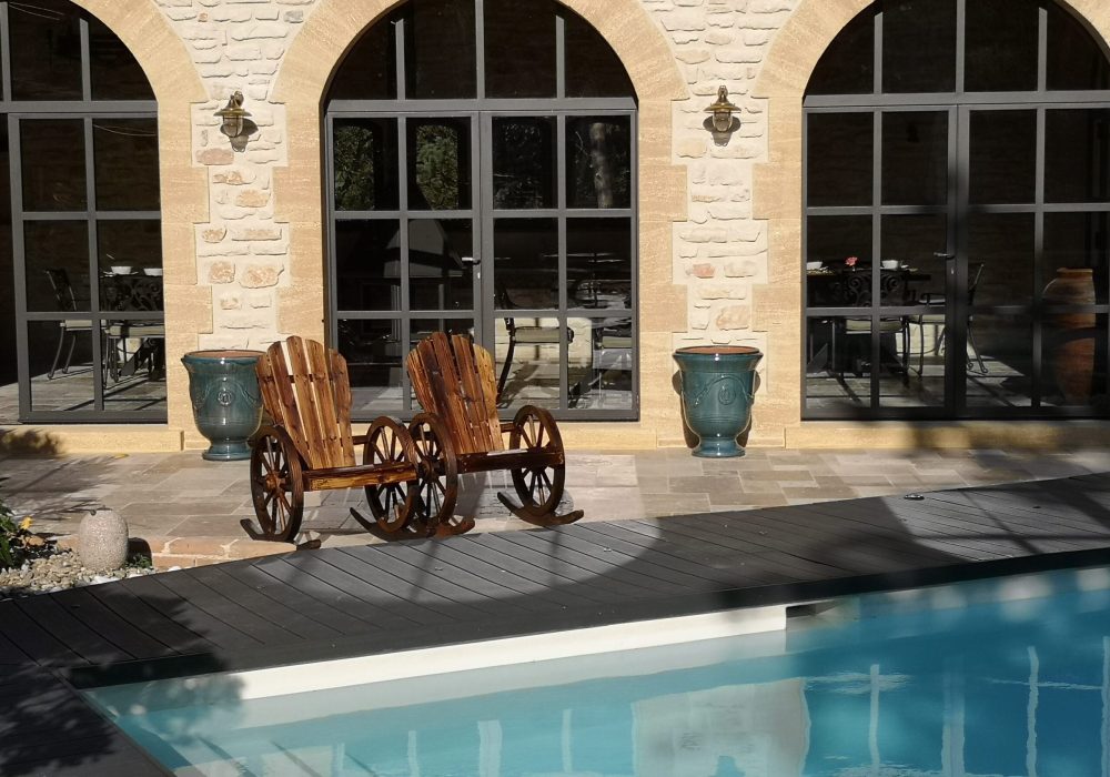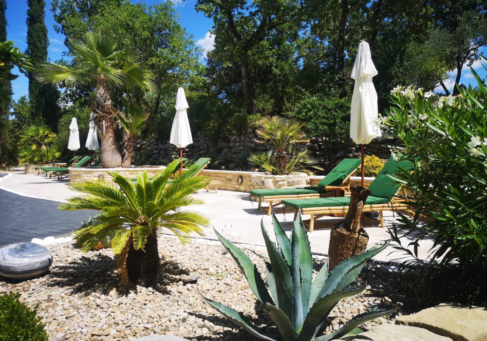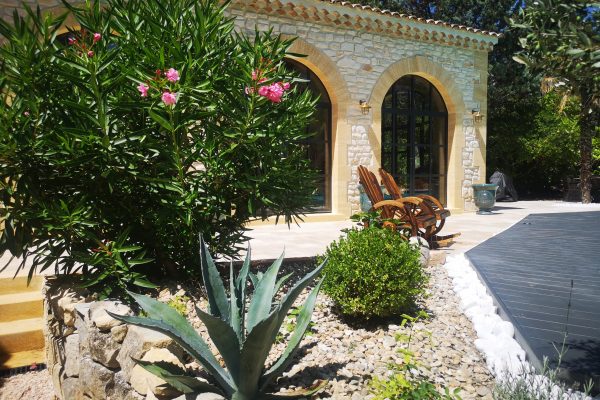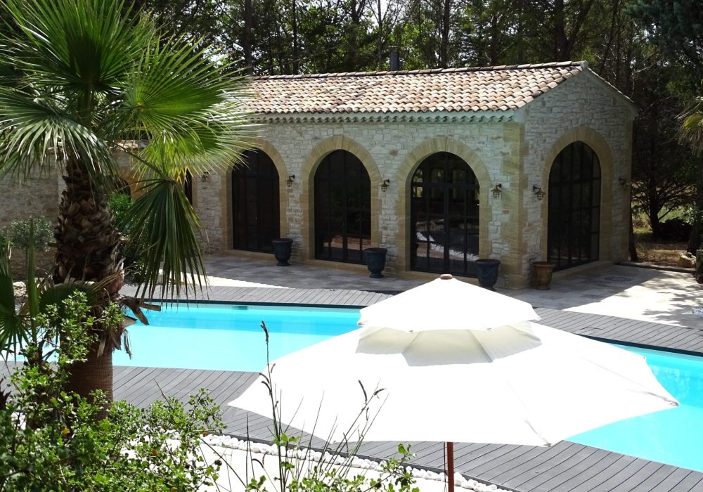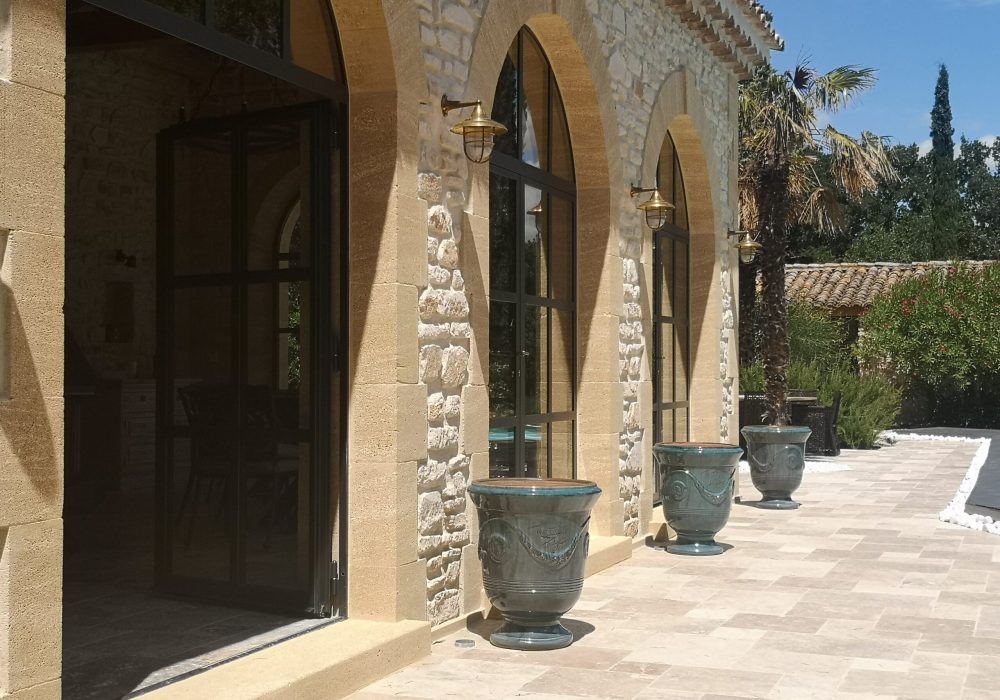 Des grands espaces, des murs en pierre de 50 cm d’épaisseur, des vieilles poutres, des vieux carreaux en terre cuite, des portes fenêtres et fenêtres en fer forgé, du travertin, une fontaine en pierre vers du pont du gard, des vielles tuiles … Si vous aimez l’histoire et les vieilles pierres vous serez très certainement aux anges.