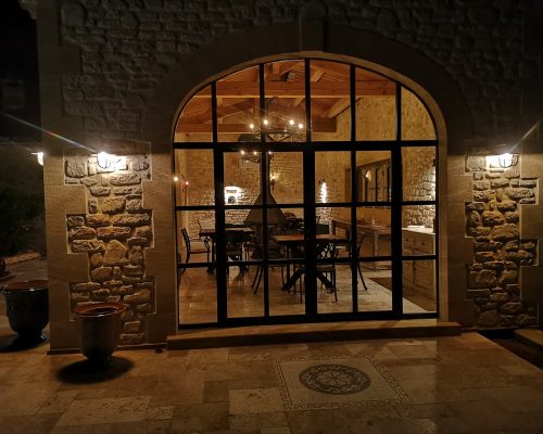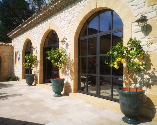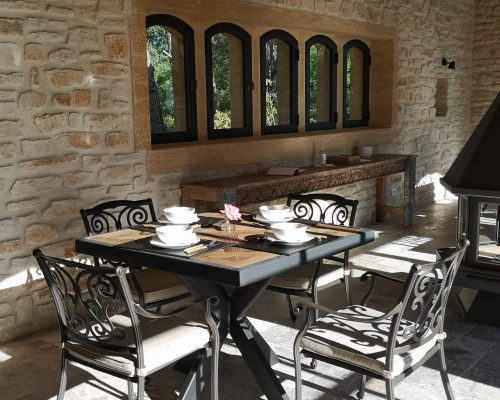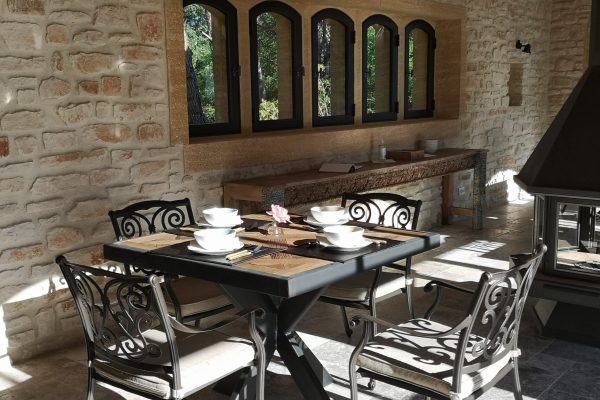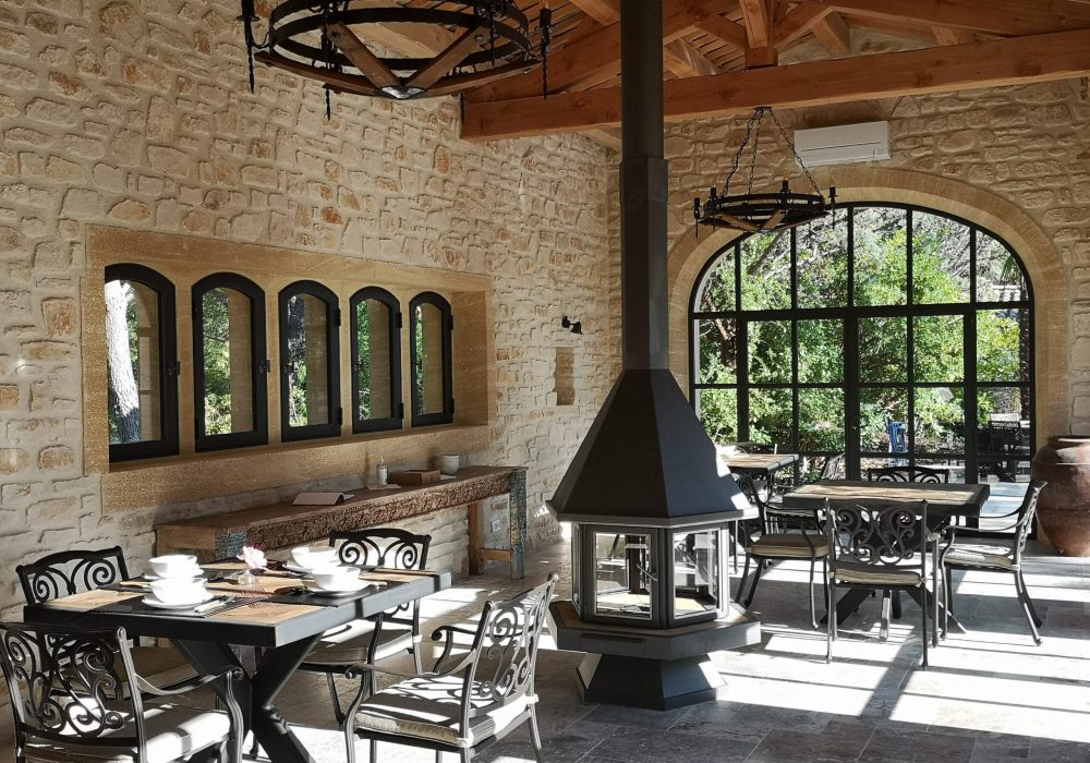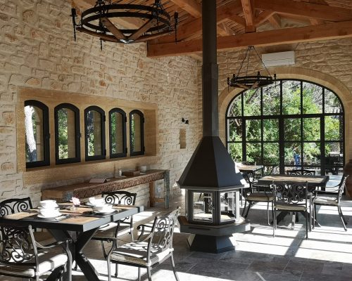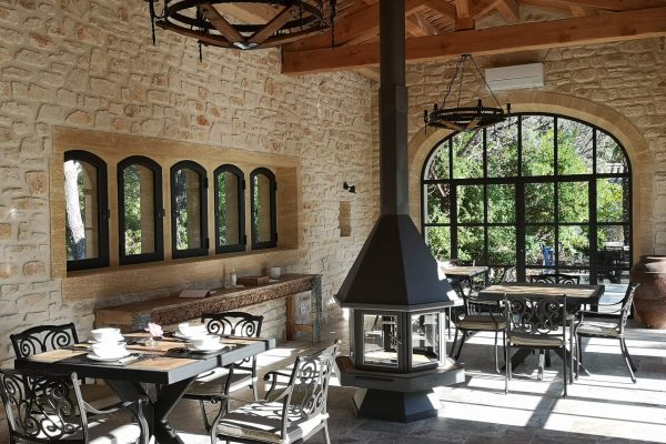 Les petits-déjeuners gourmands sont servis dans l’orangerie, un très bel espace de 49,5 m2 bâti récemment qui respecte l’histoire et le style du Mas de Castellargues (mur en pierres double face, poutres, belle charpente, pierre de taille, menuiseries en fer forgé) dont les premiers bâtiments auraient été construits au début du 18ème siècle. Pour plus de confort et en respect des conditions sanitaires, les tables sont espacées. Durant les périodes froides la cheminée centrale viendra ajoutera une note chaleureuse, comme au bon vieux temps.